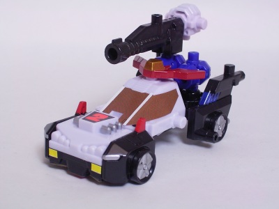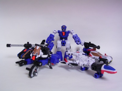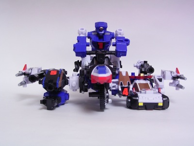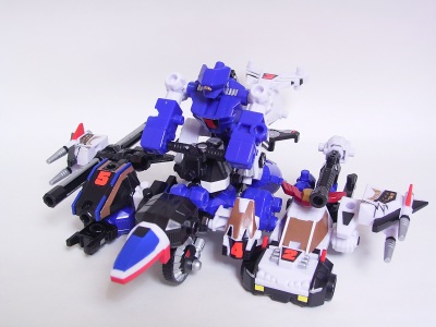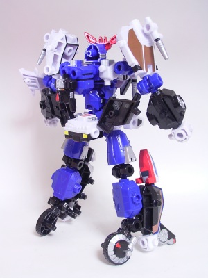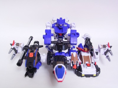 ビークル四機を合体させてバイク状態にして、ロイドを乗せた物です。 超○ビ○ューンのバイクがモチーフ。 それぞれがあんまりバラバラにならないよう、且つ車高が均一になるよう余りパーツを 配置するトコで難航。 あ、ソニックはバラけてますが。
