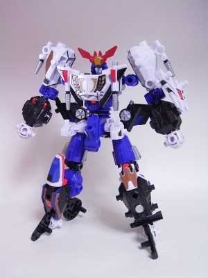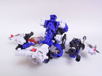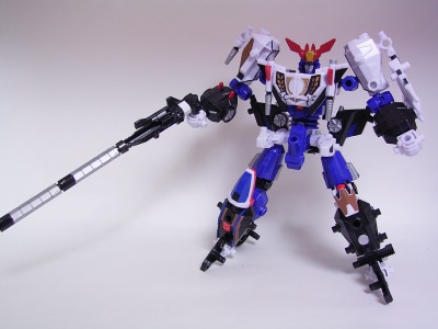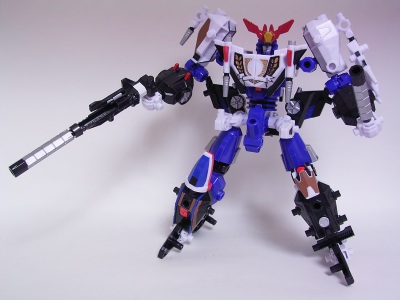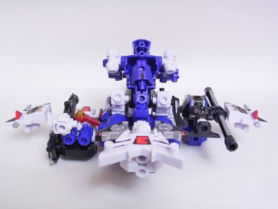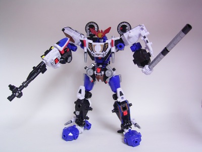 所謂オフィシャルな全合体。 マッチョなプロポーションがバイカンフーっぽい。 自分的に股間の数字が逆さまになっているのと、つま先がブロックなのが 気になります。 あと、銃にヘッドパーツがついているってのも・・・。 この角度じゃ見えませんが。 (;´Д`)